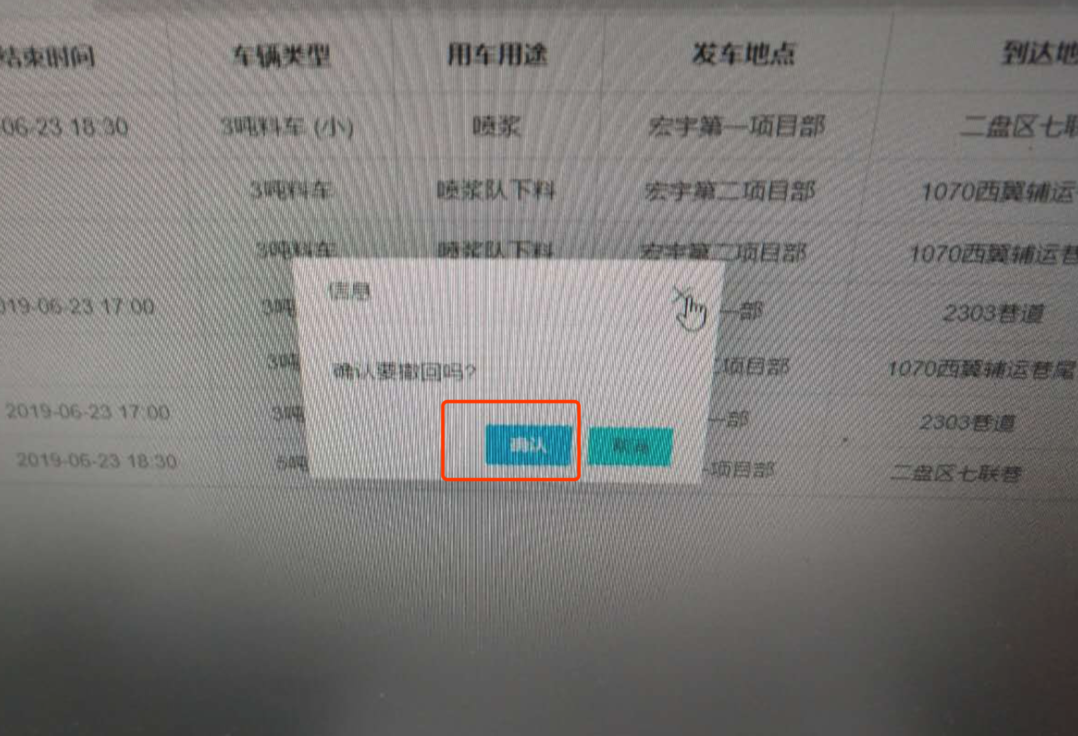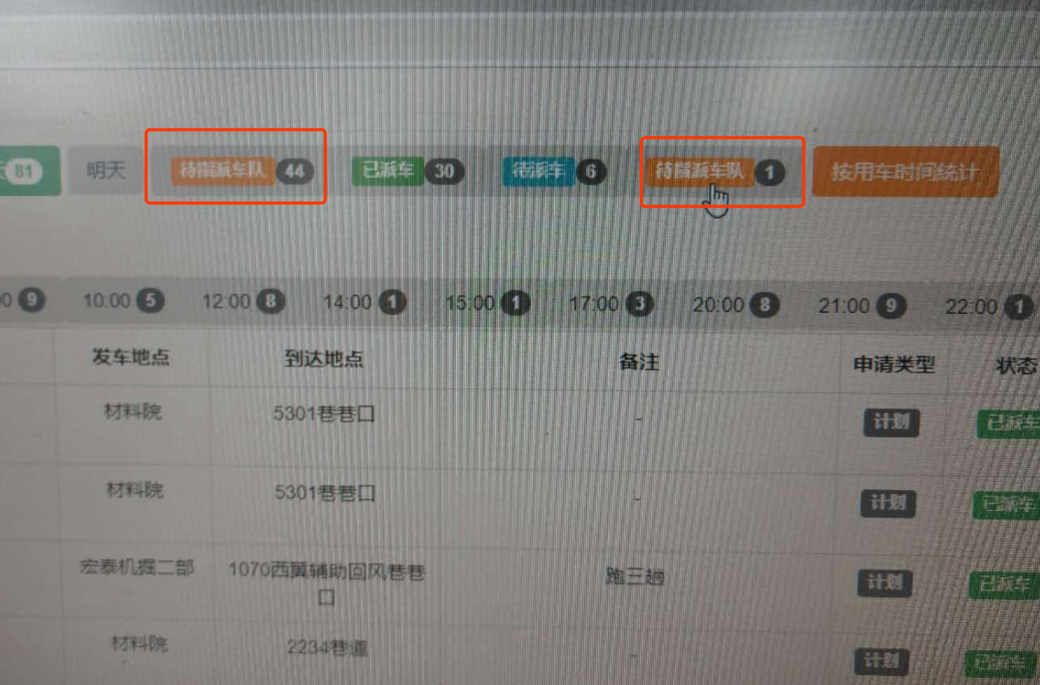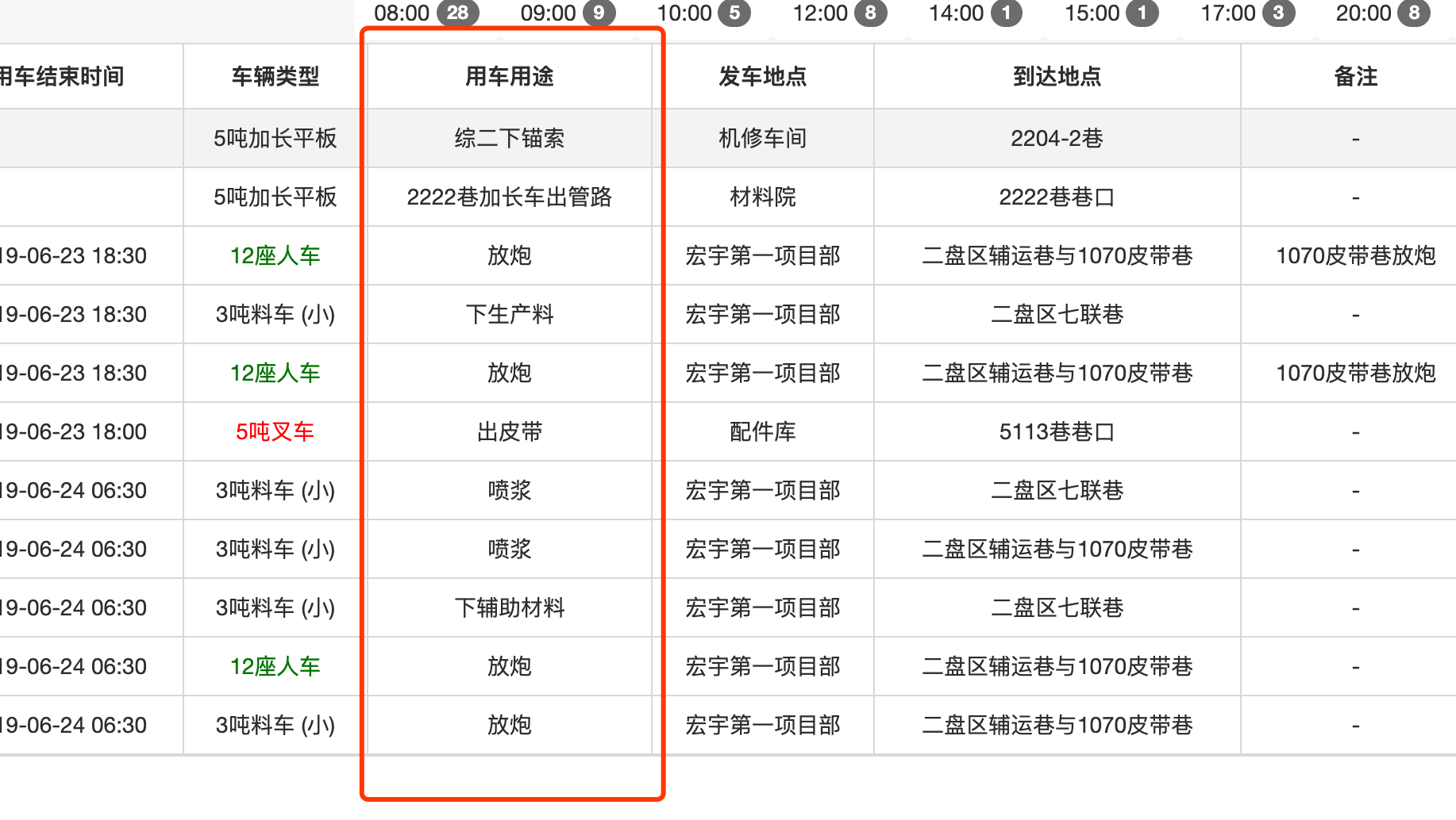 显示在界“用车用途”里,例如:铺底:3趟、 2222巷加长车出管路:1趟