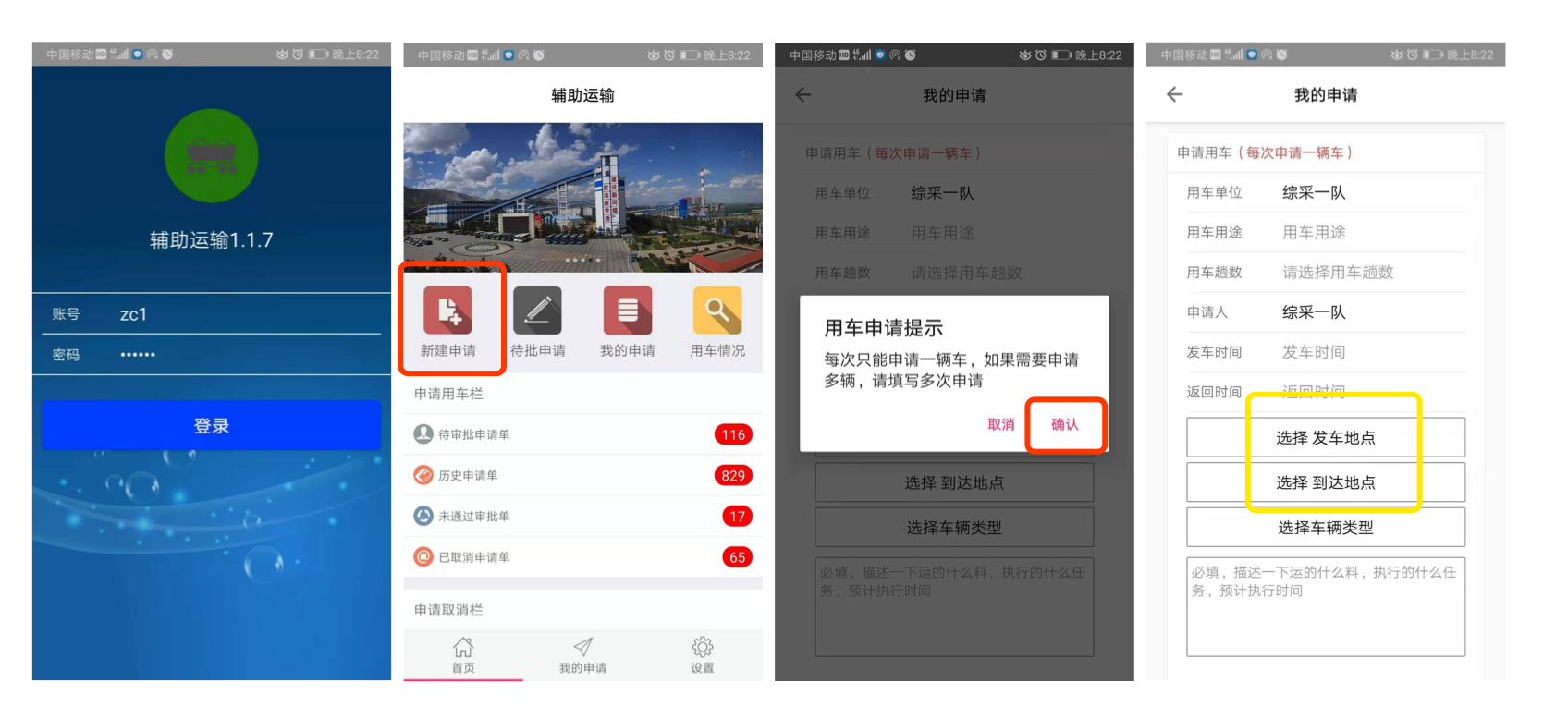 用车单位使用辅助运输客户端提交用车申请