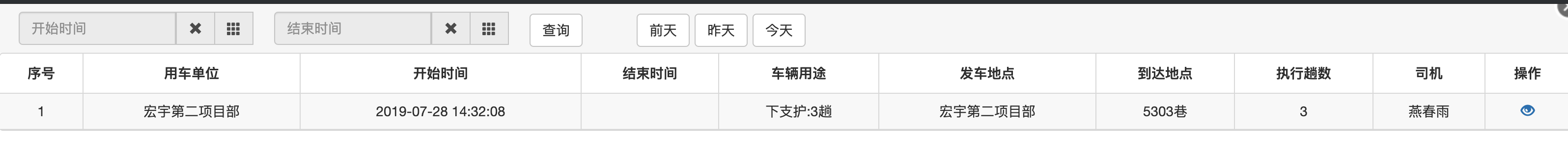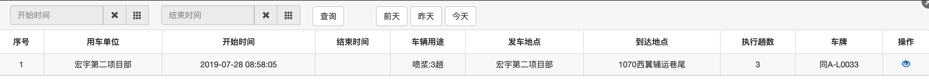 辅助运输任务自动结束工作汇报 发表于 2019-07-28 更新于 2019-11-30 分类于 汇报 功能演示空闲车辆地图展示 车辆状态统计 重车统计 井上空车统计 井下空车统计 车辆司机分类列表 今日车辆历史列表 今日司机历史列表 用车申请任务详情 数据统计 7月11号开始,修改了计算算法,执行结果成功率有一定的提升从21.7%提升到30.6% 7月18号开始,再次优化计算算法,执行结果成功率有一定的提升从30.6%提升到40.8% 案例分析 目的地完全不正确案例 任务包含多个目的地案例 派车时间晚于执行时间案例 经典成功案例 数据统计与案例分析详情